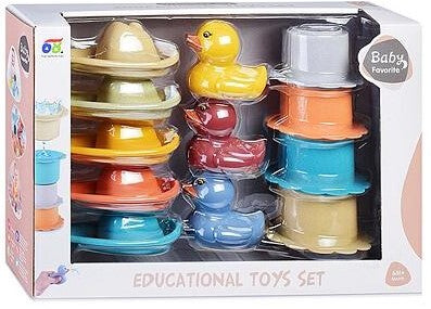 Includes 3 rubber ducks, 4 stacking cups, and 5 bath boats for endless fun.