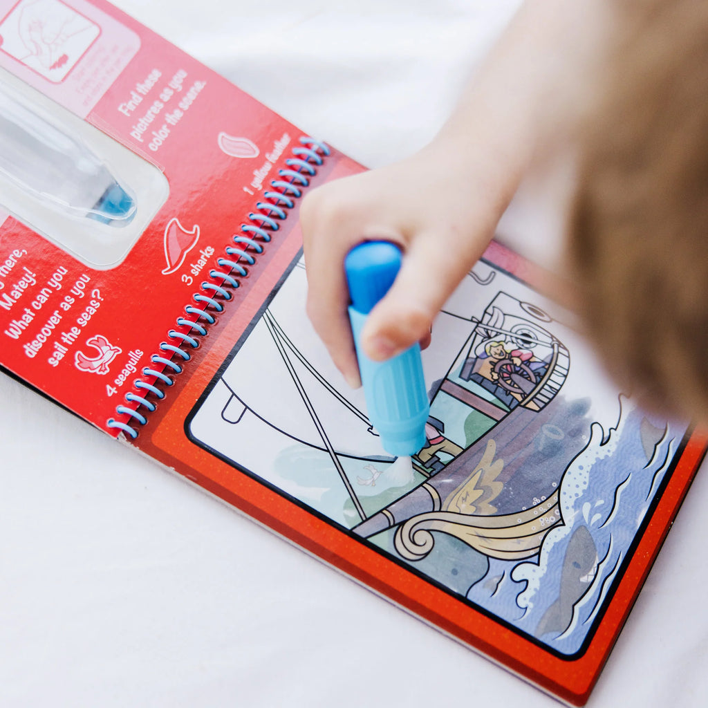 This exciting paint-with-water colouring book includes four reusable pages and a refillable water pen.