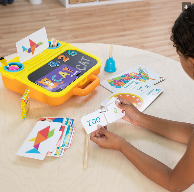 • Set of learning cards and supplies stored in a travel-friendly school desk