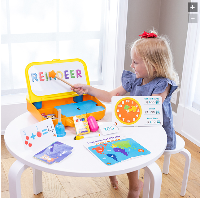 • Includes school desk storage case, 48 magnetic letters, 24 magnetic numbers, chalk, eraser, pointer, bell, magnetic tangrams, 4 laminated tangram cards, 30 sight words cards, 4 math cards, 8 spelling cards, world map, calendar, alphabet card, clock card for teaching time, dry erase marker