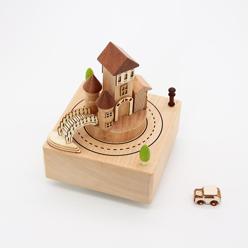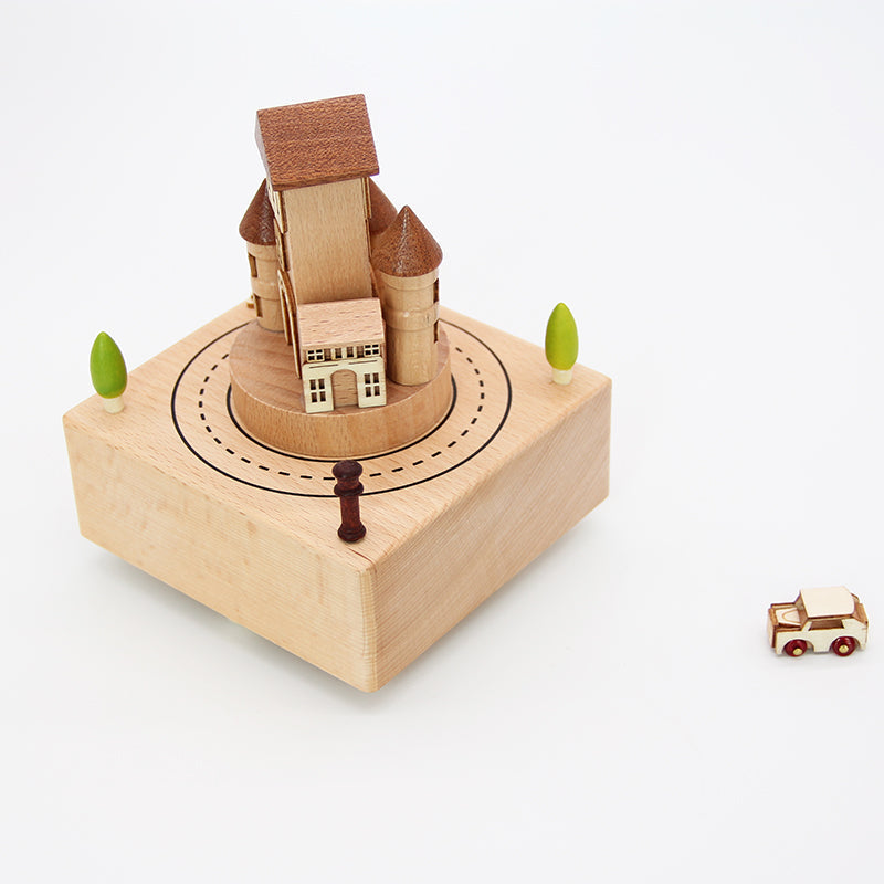 This exquisite Royal Castle wooden music box features a handcrafted royal castle, a drawbridge and a tiny car that chugs around the base of the castle in time to the music on a hidden mechanical track