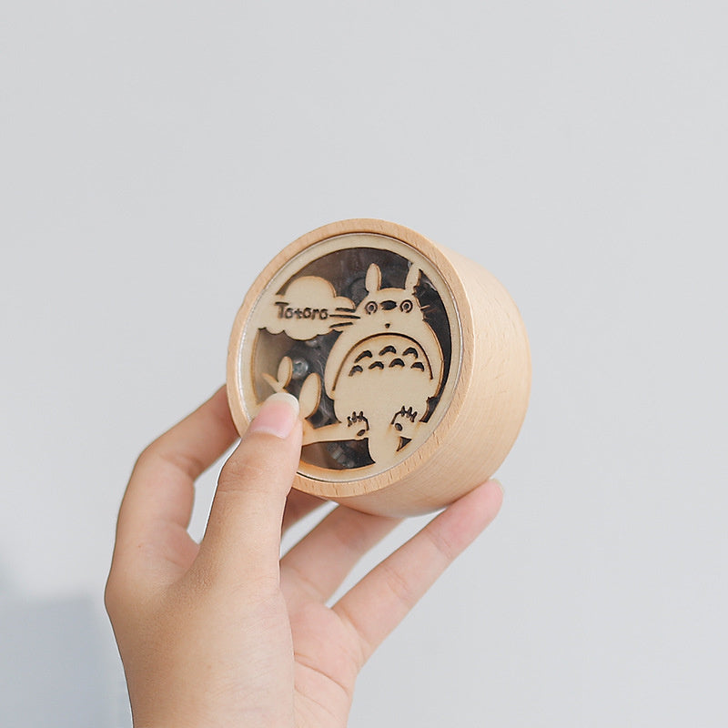 Admire the intricate craftsmanship of this Round Wooden Music Box - Cut Out Totoro Clover