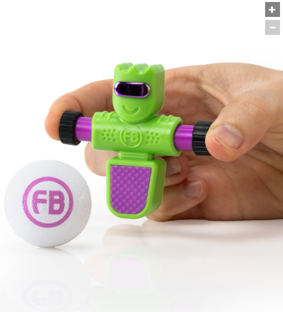 When you squeeze its arms, it spins to kick the ball FAST. Can you get the ball past your opponent's goal while letting nothing past yours?