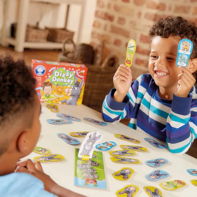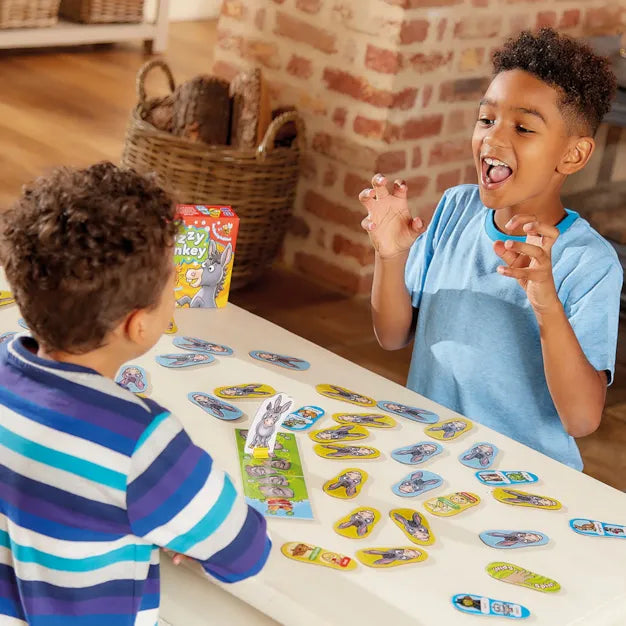 This game is full of exciting twists - turn over a 'spin' card and everyone jumps up and spins around, but turn over a donkey card and everyone must pop up their donkey ears and move the donkey one step closer to the carrot!