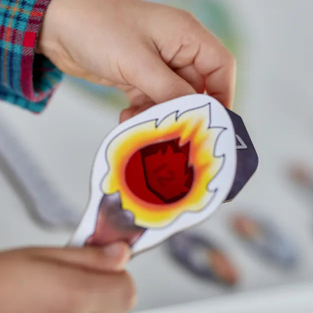 If they land on a plus or minus square they solve one of their four addition and subtraction sums, then they can check their answers using the magic viewer. If correct they hook the completed sum over the 3D mammoth's trunk!
