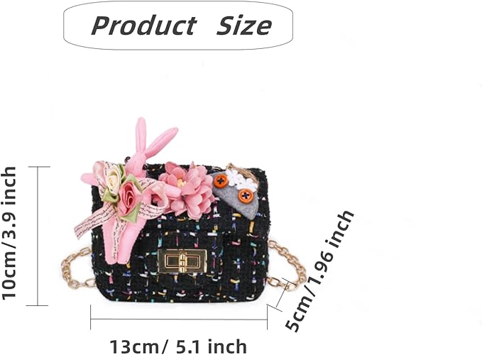 Designed for little fashionistas, this adorable kids’ tweed bag brings elegance and fun together! Featuring delicate rabbit, flower, and button embellishments, a gold clasp, and a gold shoulder chain, it’s a perfect mini version of mum’s sophisticated style.