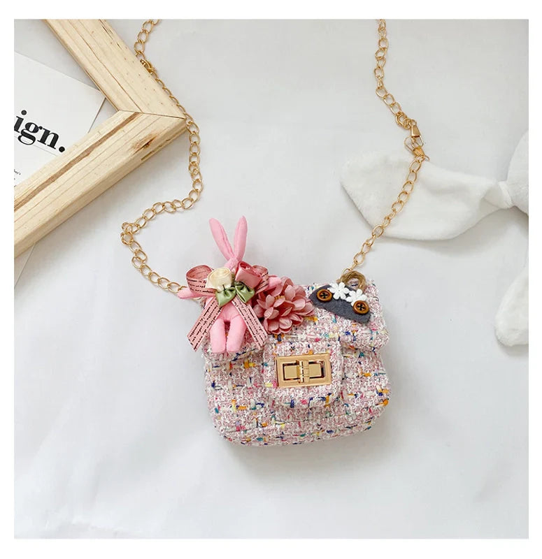 Designed for little fashionistas, this adorable kids’ tweed bag brings elegance and fun together! Featuring delicate rabbit, flower, and button embellishments, a gold clasp, and a gold shoulder chain, it’s a perfect mini version of mum’s sophisticated style.