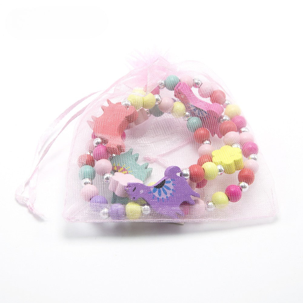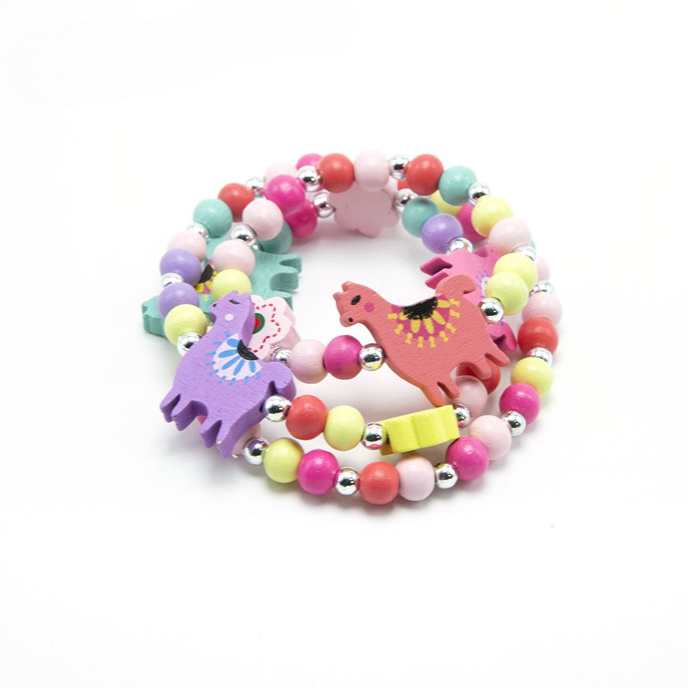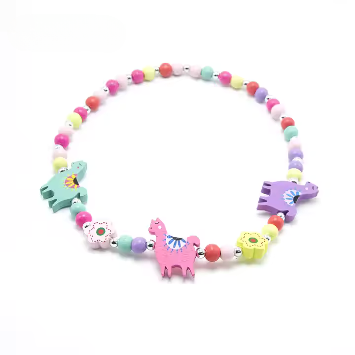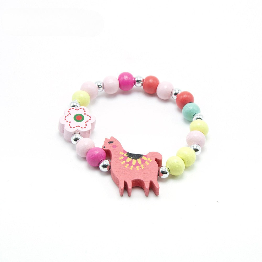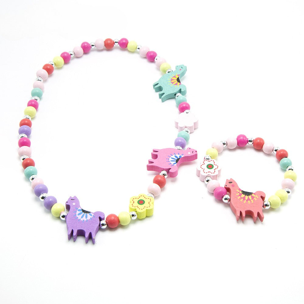 Step into a world of cheerful charm with this delightful necklace and bracelet set. Designed with soft wooden beads in pink tones and luminous plastic pearls, each piece features a lovable alpaca pendant and an array of colorful floral accents. Perfect for adding a dash of fun to any ensemble, this set celebrates whimsy, nature, and joy.