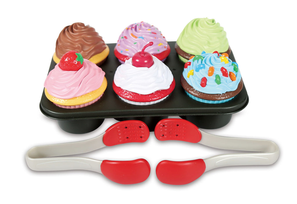 • For Little Hands: This fake food set is a fun way to introduce toddlers 3+ years old to kitchen play. The magnet cupcake toy helps develop fine motor skills as children scoop and stack flavours.