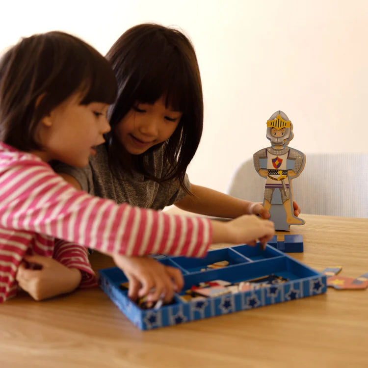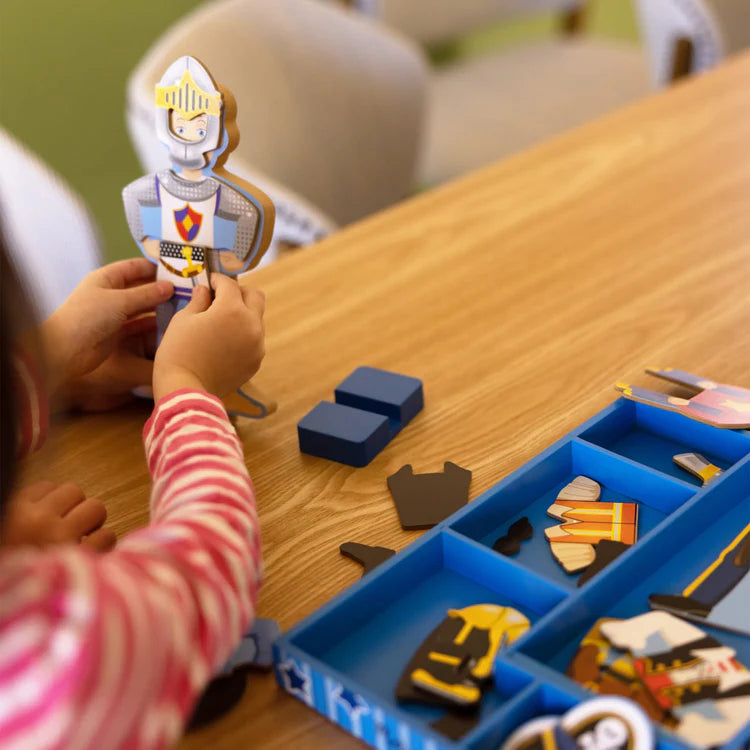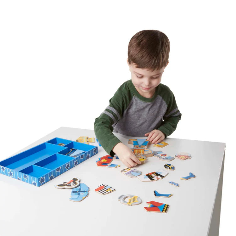 - Includes 1 wooden play figure and stand, plus 26 magnetic pieces of clothing and gear (firefighter, superhero, knight, and more)