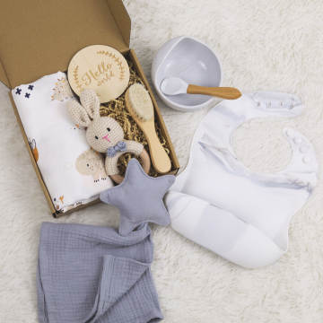 This 8 piece set includes a Bamboo Cotton Muslin Swaddle, Muslin Lovey blanket, handmade crochet rattle, silicone bib, bowl and spoon, wooden brush and milestone cards.