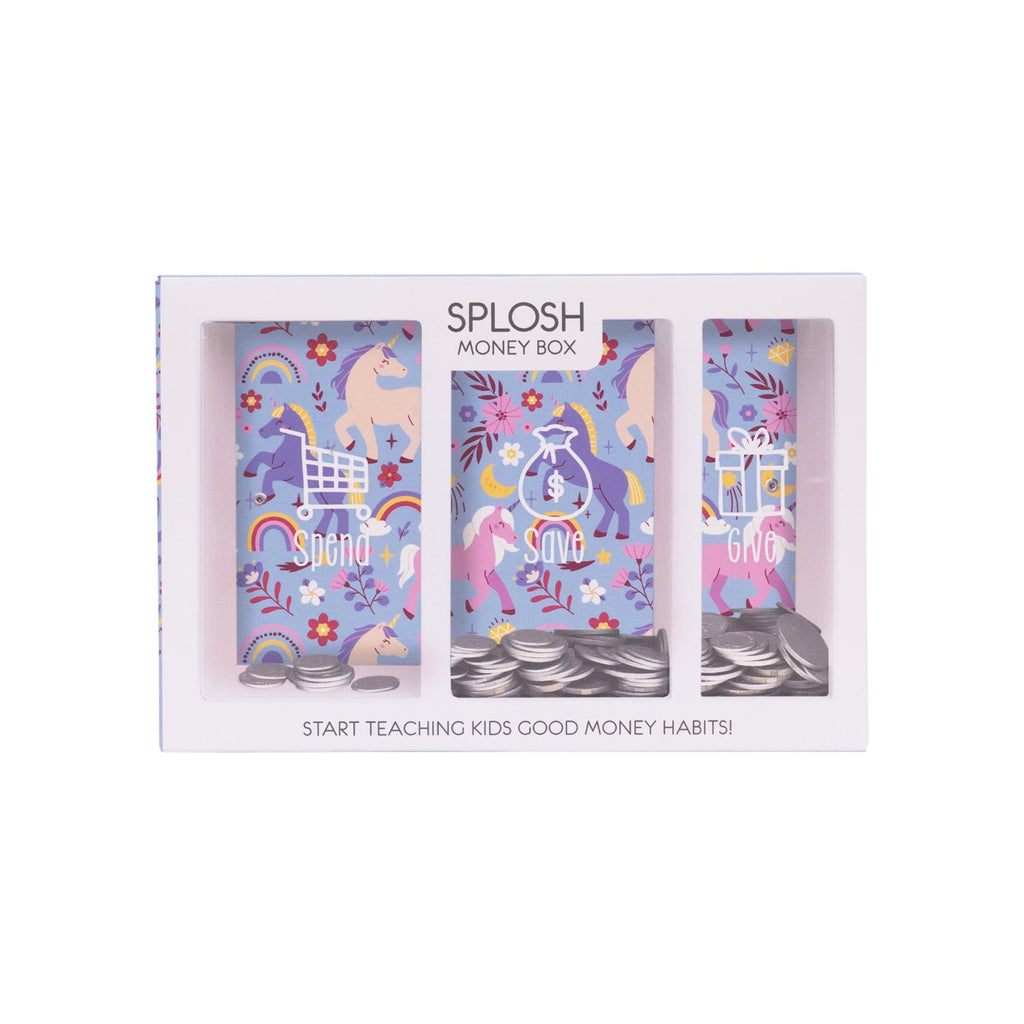 • This money box has three slots to help kids spend, save and give. Wooden frame with a clear acrylic front window so you can see the savings grow.