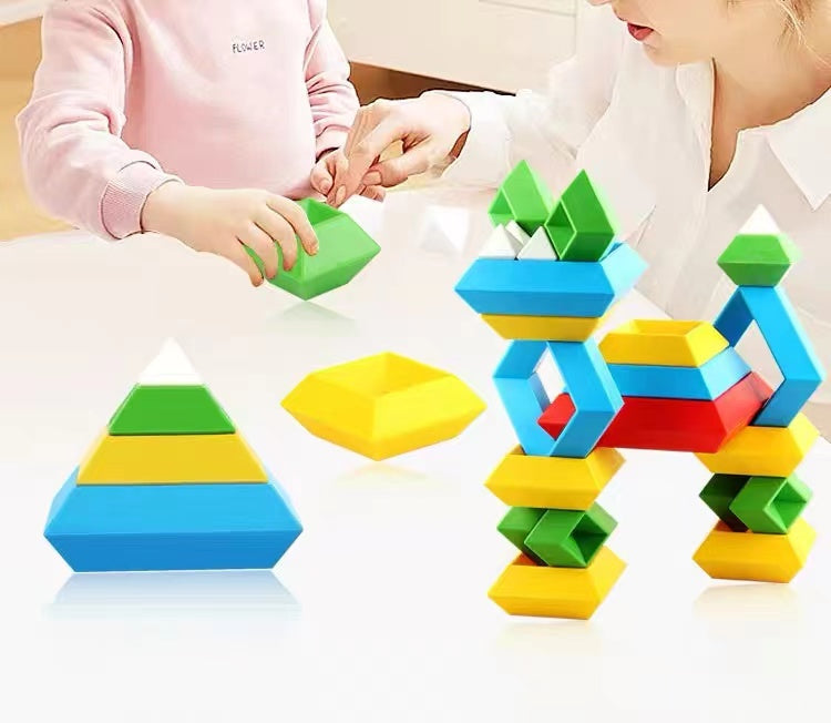 This set of 30 geometry building blocks can be stacked in a variety of way by rotating and nesting the pieces - the possibilities are limited only by the imagination.