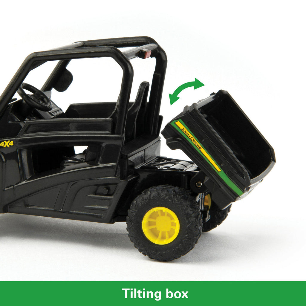 The John Deere RSX 860i gator features a tilting box that makes it easy to unload the included hay bales to feed the horses and foals.