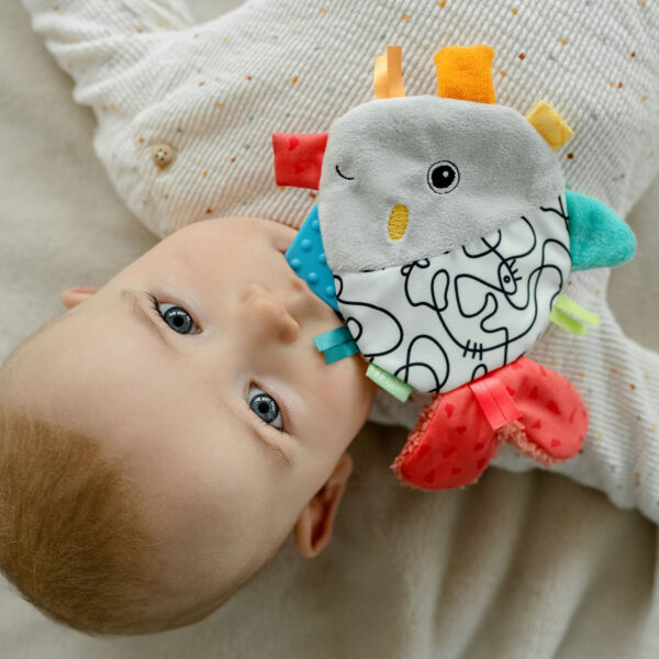 Made from soft materials like velours, terry, and plush, it features hidden crinkly paper for sound stimulation and a soft teether for teething relief.