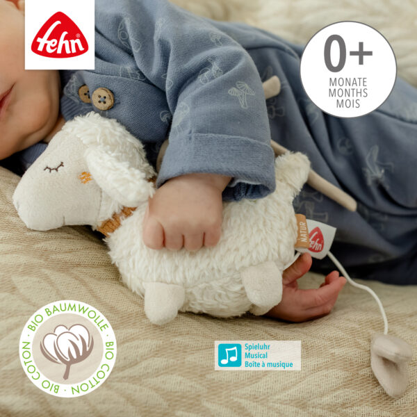 The fehnNATUR® Mini Musical Sheep is a comforting companion for babies and toddlers, crafted from organic cotton for a soft, sustainable touch.