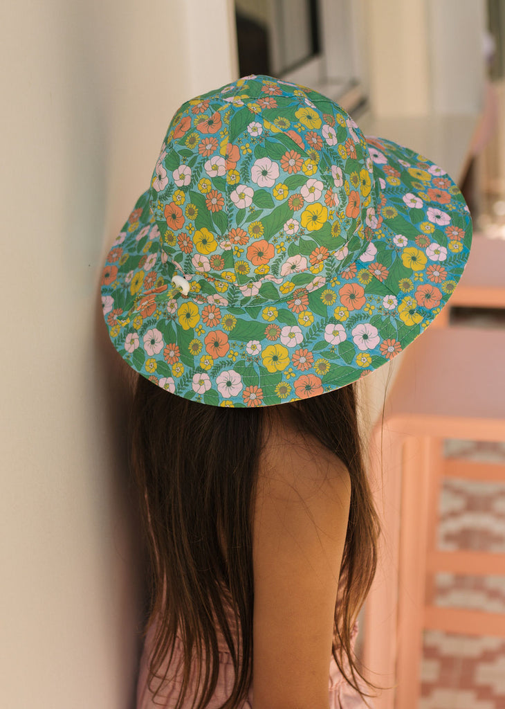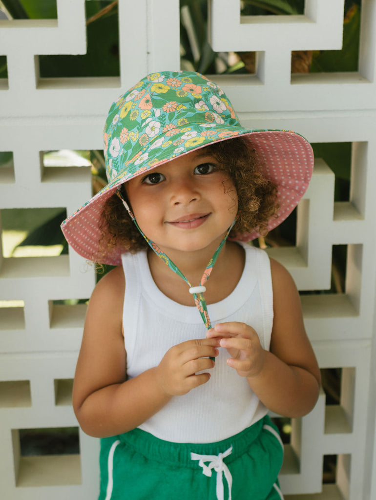 Let little imaginations bloom in the sunshine with this stunning wide-brim sunhat, featuring a gorgeous vintage-inspired mint floral print on the outside, designed by Jacinta Weir from Two Little Ducklings and sweet pink and white polka dots on the inner brim.