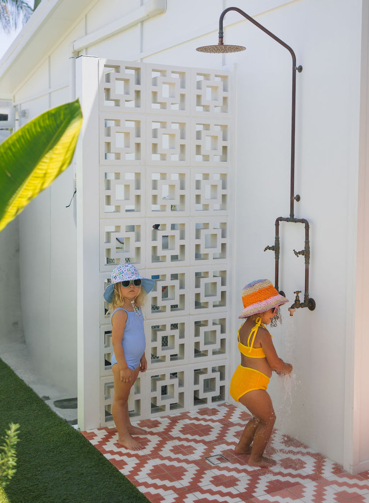 Bring a touch of joy to every day with this wide brim sunhat, featuring a sweet 70's-inspired print on the outside and a fun blue-and-white polka dot on the inner brim. Designed by Jacinta Weir from Two Little Ducklings, it’s made for fun in the sun!