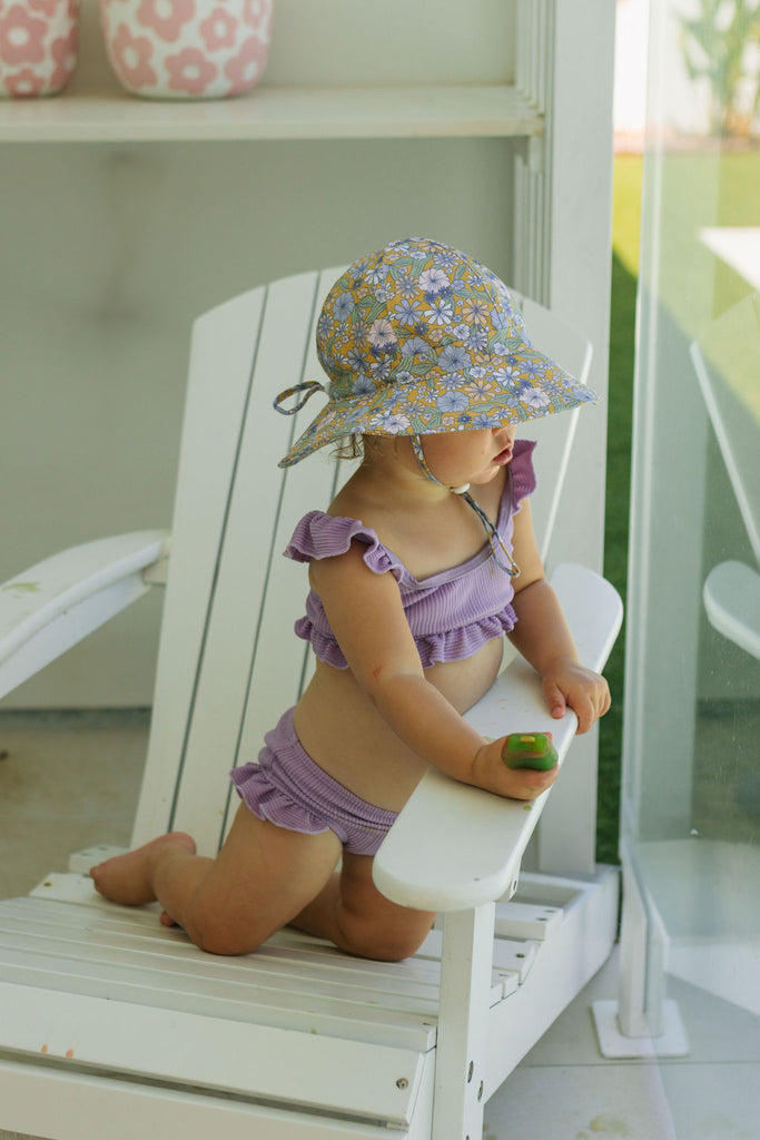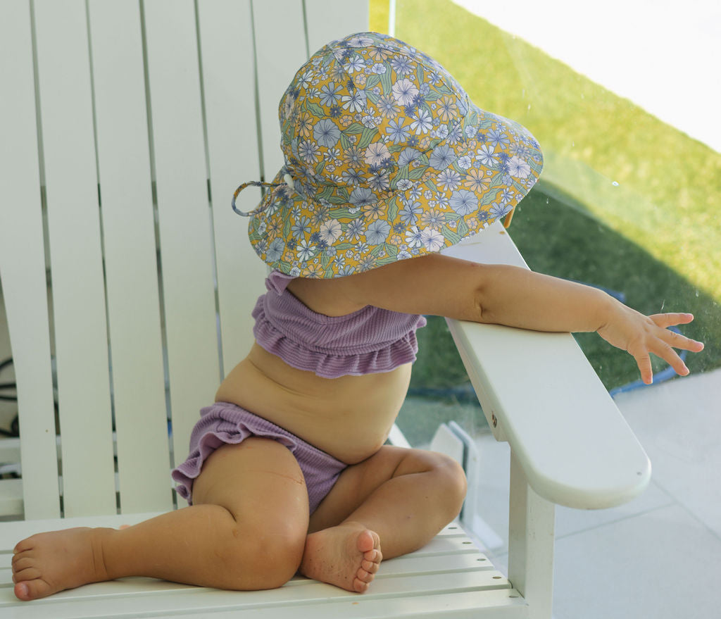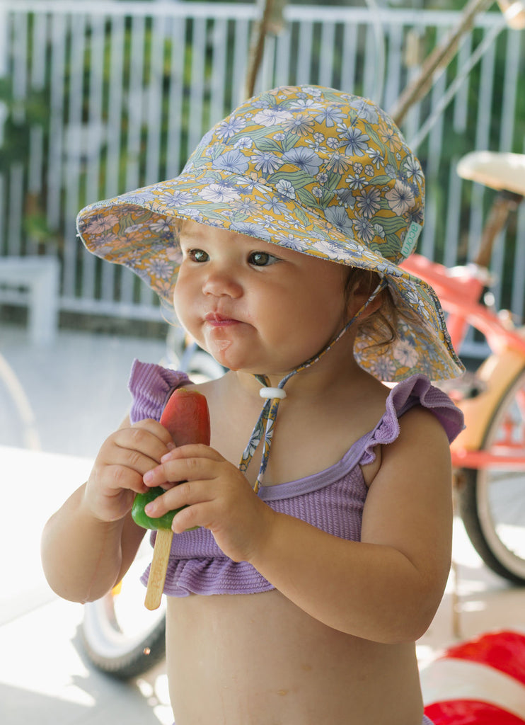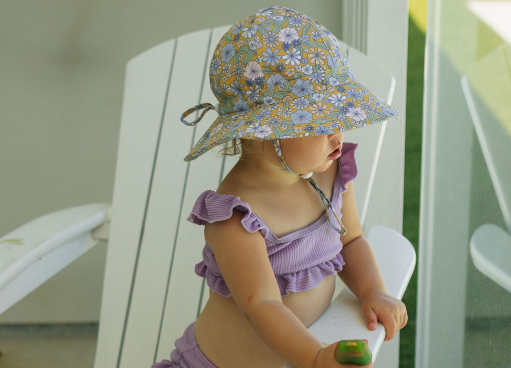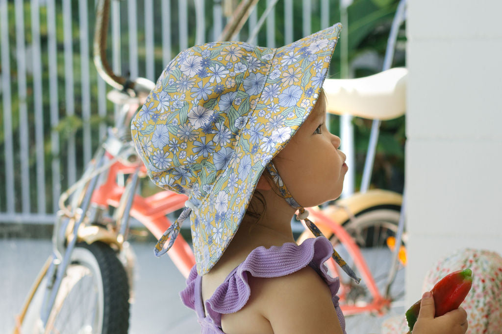 Perfect for sunny days at the park, beach, or backyard adventures, this wide brim sunhat features a sweet pink daisy print, designed by Jacinta Weir from Two Little Ducklings.