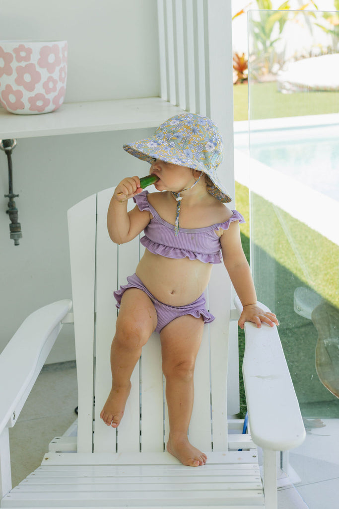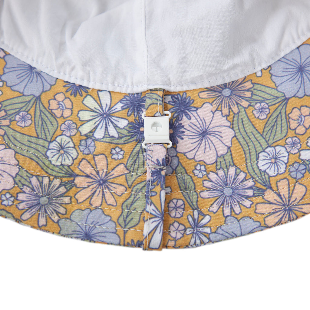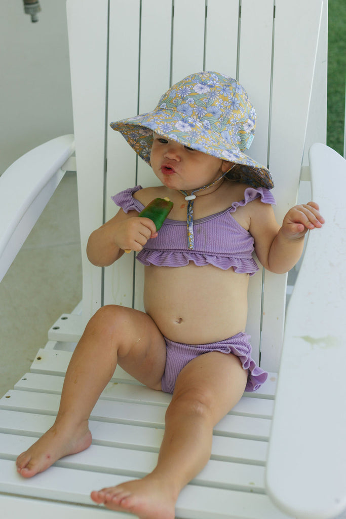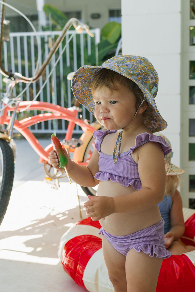 Perfect for sunny days at the park, beach, or backyard adventures, this wide brim sunhat features a sweet pink daisy print, designed by Jacinta Weir from Two Little Ducklings.