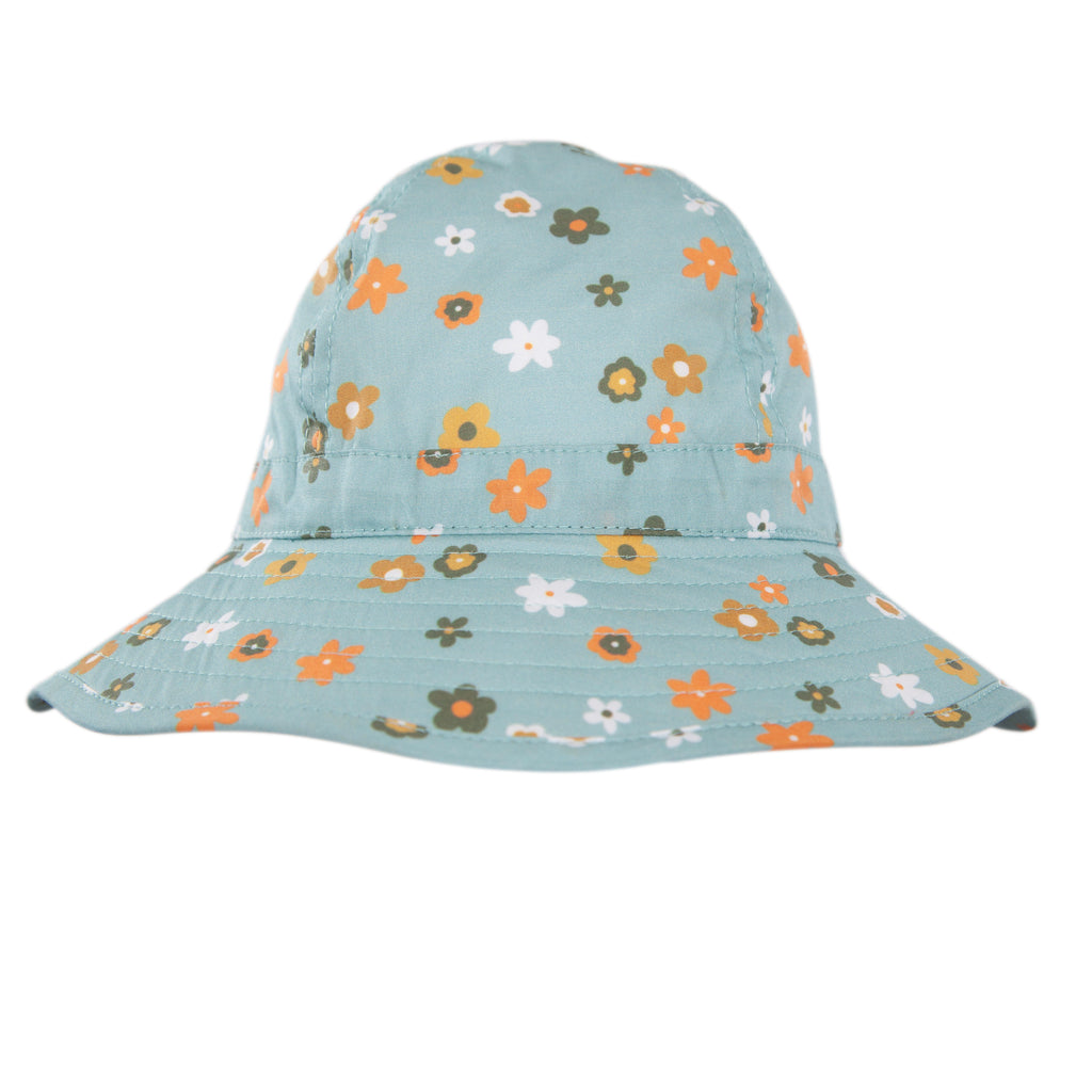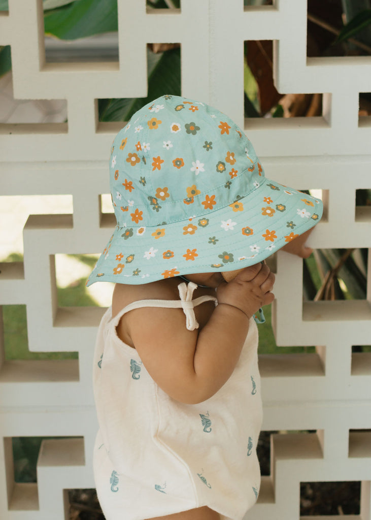 A darling first sunhat for little ones, featuring the sweetest scattering of tiny flowers designed by Melbourne artist Jacinta Weir of Two Little Ducklings. Crafted from 100% cotton (including lining), it’s soft, breathable, and perfect for delicate skin.