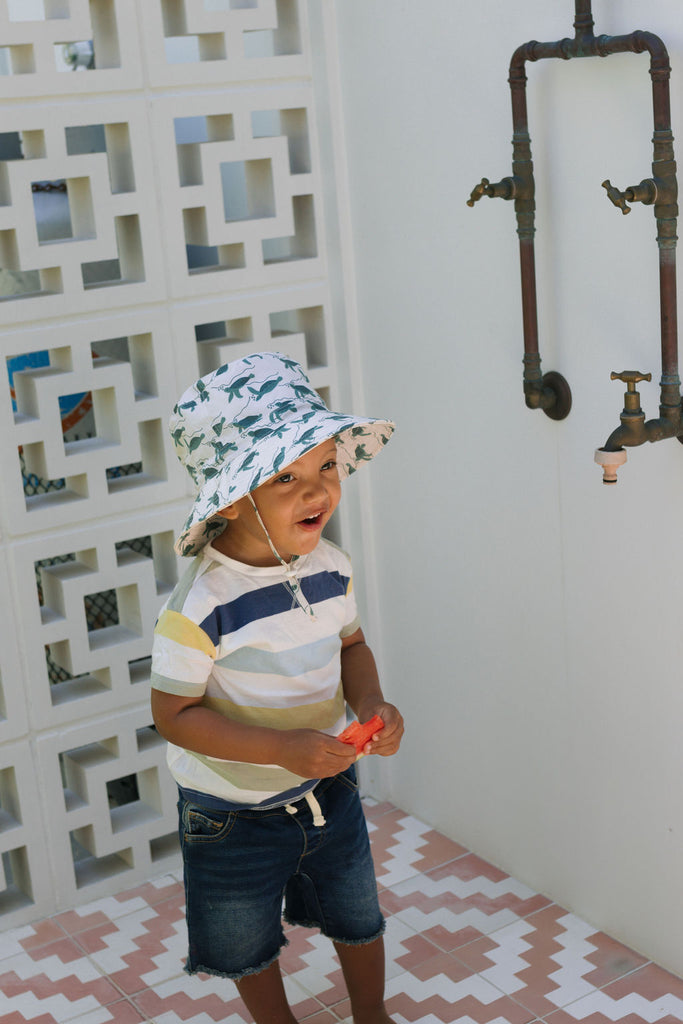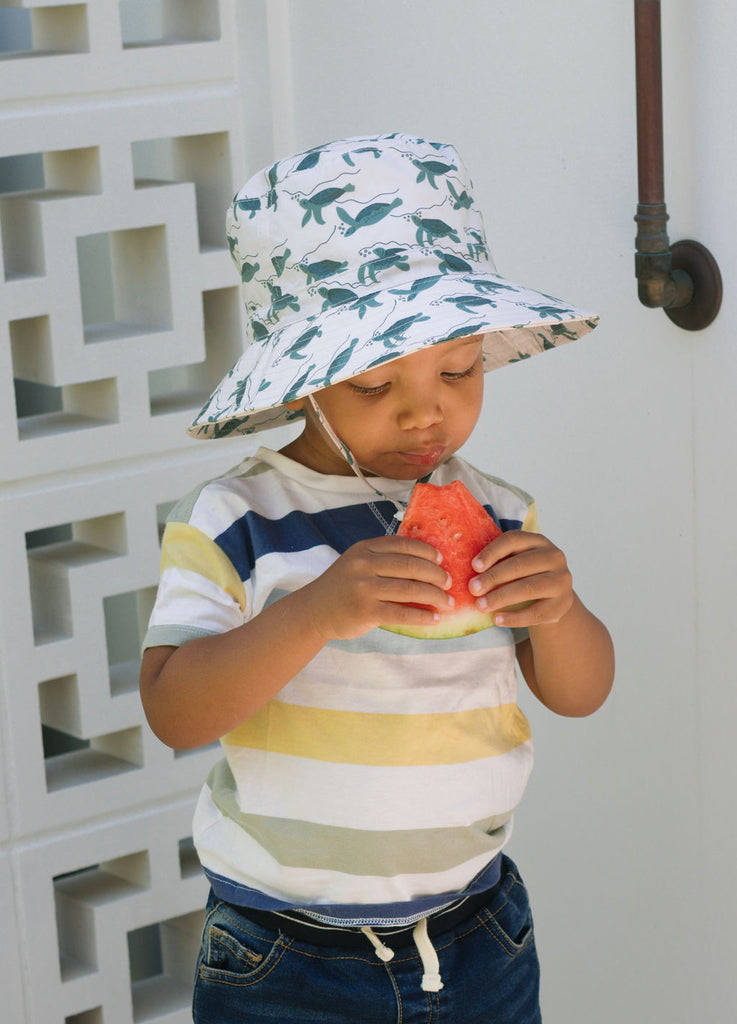 Make a splash this summer with this adorable bucket hat featuring a playful swimming turtles print on both the outside and inner brim. The original artwork was designed in Melbourne by Jacinta Weir from Two Little Ducklings.