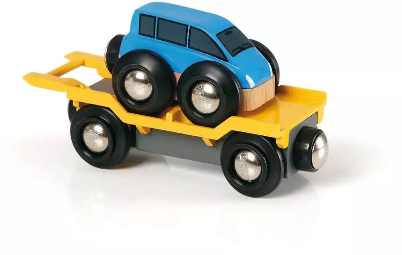 Load up the car and couple the wagon up to any BRIO train and off you go. Let the car drive on and off the transporter by tilting the wagon ramp.