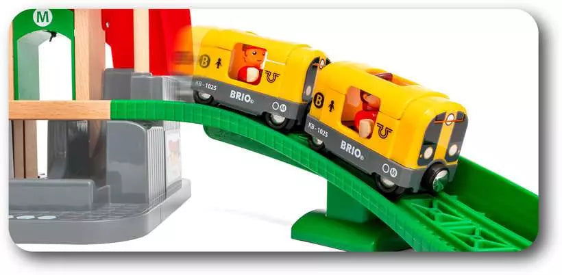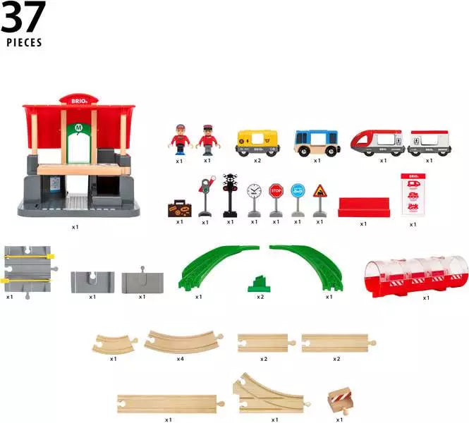 Central Station Travel Set includes 37 pieces: 1x Two-level Central Station, 1x Metro Train, 1x Travel Train, 1x Bus, 1x Railway Crossing, 2x Sloping Curved Tracks, 10 x Wooden Tracks and lots of railway accessories.