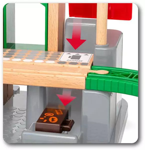 Central Station: Start your journey in this classic toy train set at the large central station where passengers can choose to take the lift or stairs to transfer between bus and train routes.
