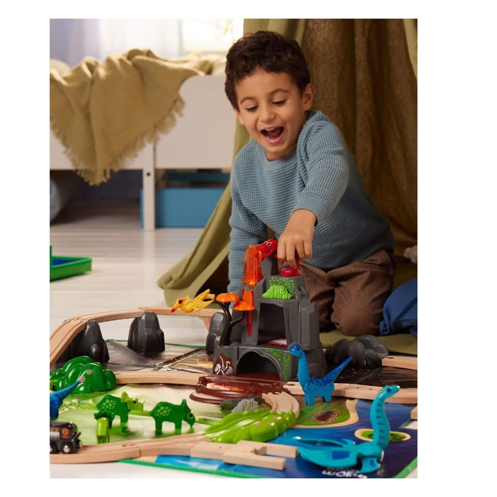 Dinosaur Deluxe Set includes 45 pieces: 8x Dinosaur Figures, 1x Erupting Volcano, 1x Lava Cave, 1x Grassy Cave, 1x Dinosaur-themed train with wagons, 4x Scene Track Pieces, 3x Track Supports, 18 Wooden Tracks/Switches and multiple accessories.