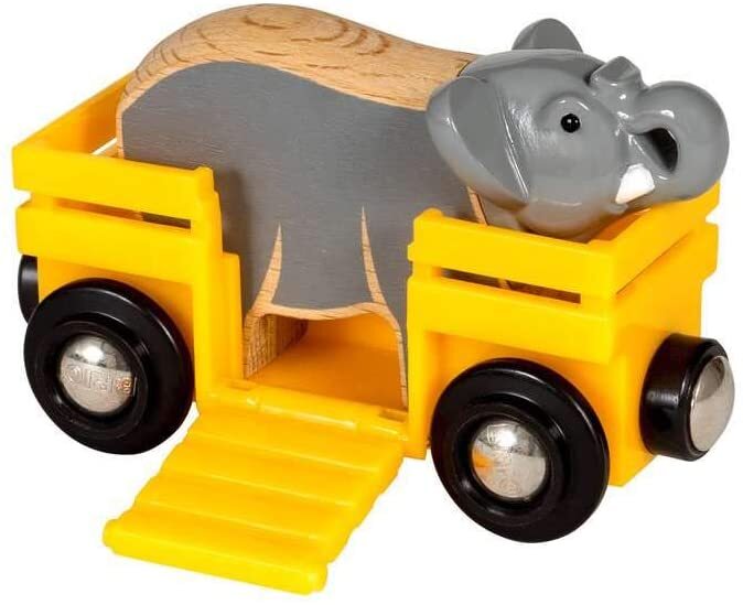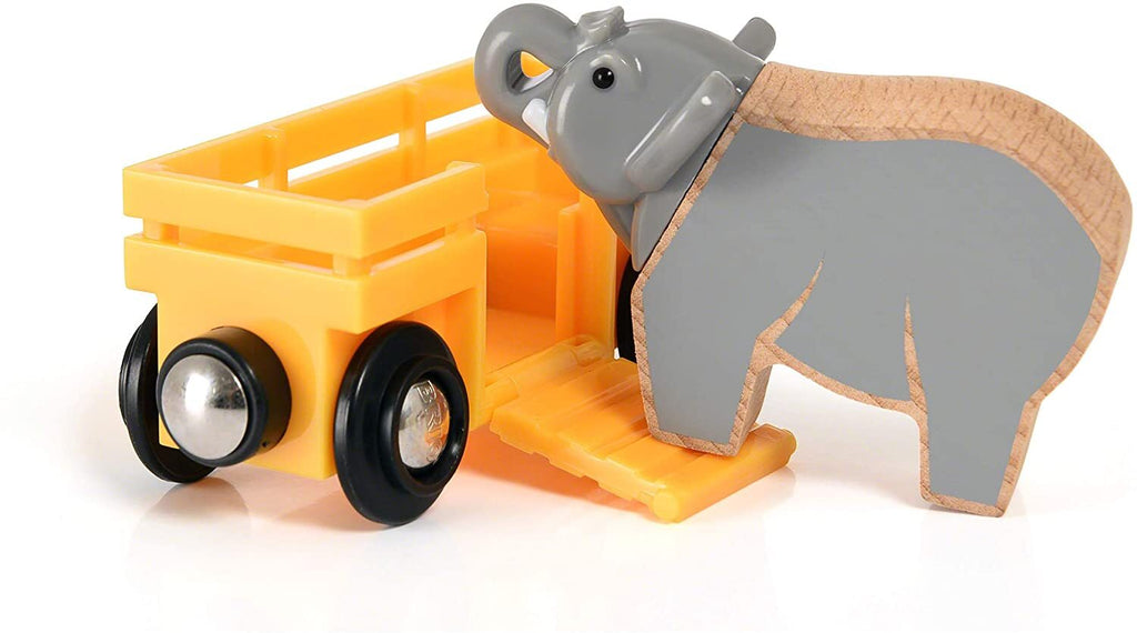 The powerful elephant with its wooden body fits snugly into the sturdy yellow wagon, which has a loading bridge and magnetic connectors at either end for easy coupling and decoupling.