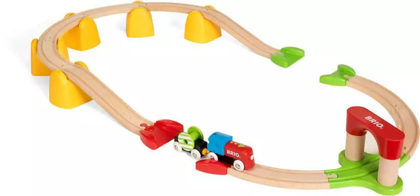 Wow! So much fun can be had with this lovely set. Start by building a track layout with the mountain blocks and the tunnel, then let your train go up and down and through the tunnel.