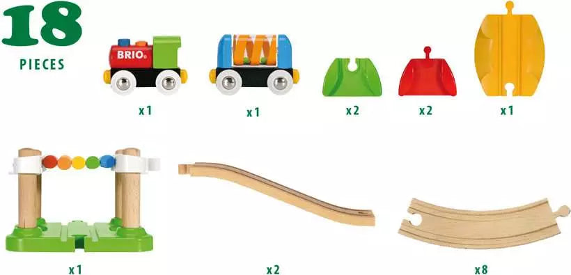 My First Railway Beginner Pack includes 18 pieces; 1x Train, 1x Rattle Carriage, 11x Pieces of Wooden Track, 4x Guiding Ramp Tracks, 1x Colourful Bridge/Tunnel.