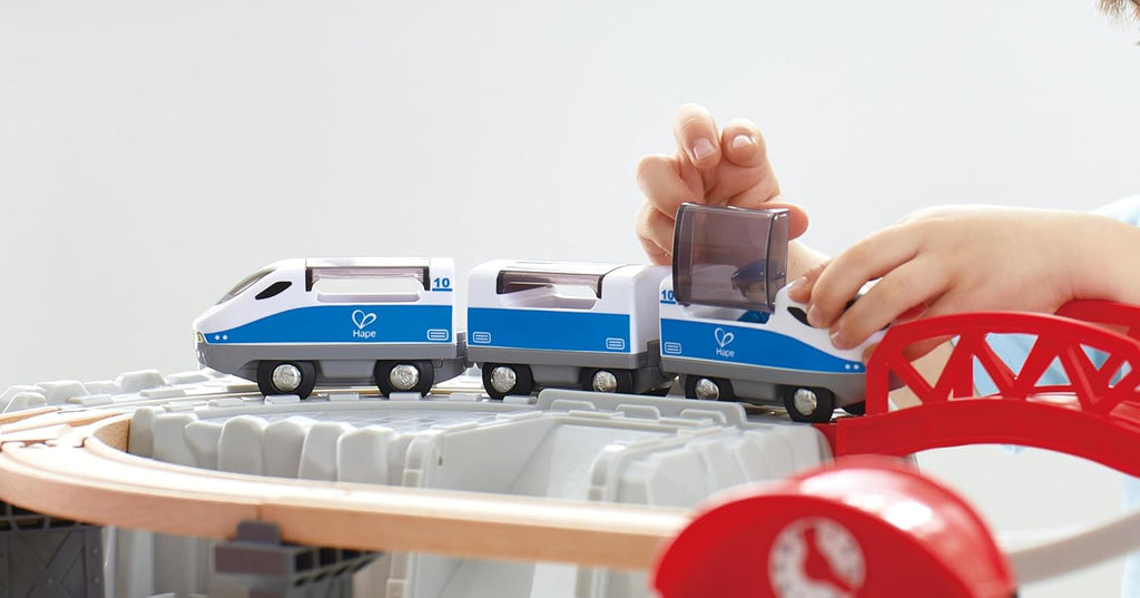 Let your little conductor explore the exciting world of trains with the Hape City Train Bucket Set!