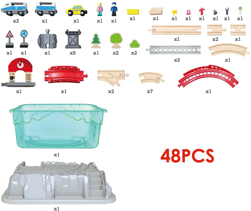 This interactive wooden railway playset features a locomotive, two carriages, train tracks, ore loads, and accessories—everything needed for an engaging and creative playtime experience.