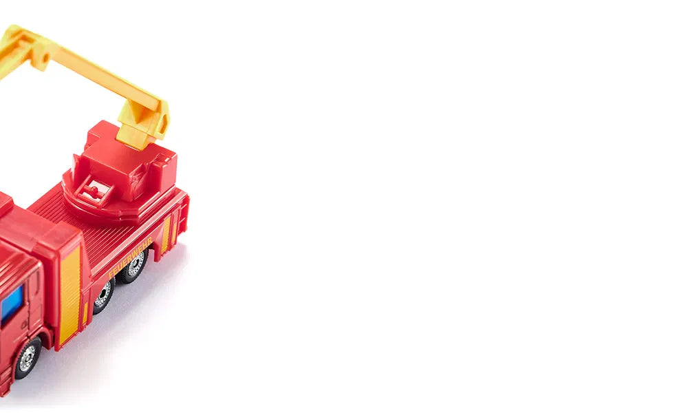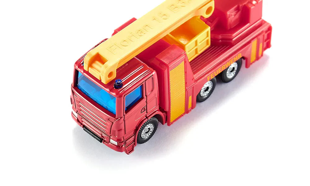 The siku fire brigade elevating rescue platform dashes to the emergency on a 3-axle chassis with a metal cab.