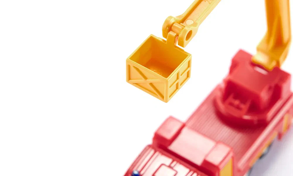 Rescue at a great height! Fire on the fourth floor, and no escape is possible via the stairs – then the fire brigade rescue platform arrives on site at the emergency. Just like the full-scale prototype, the boom rotates, the basket pivots, and the elevating rescue platform can be folded out.