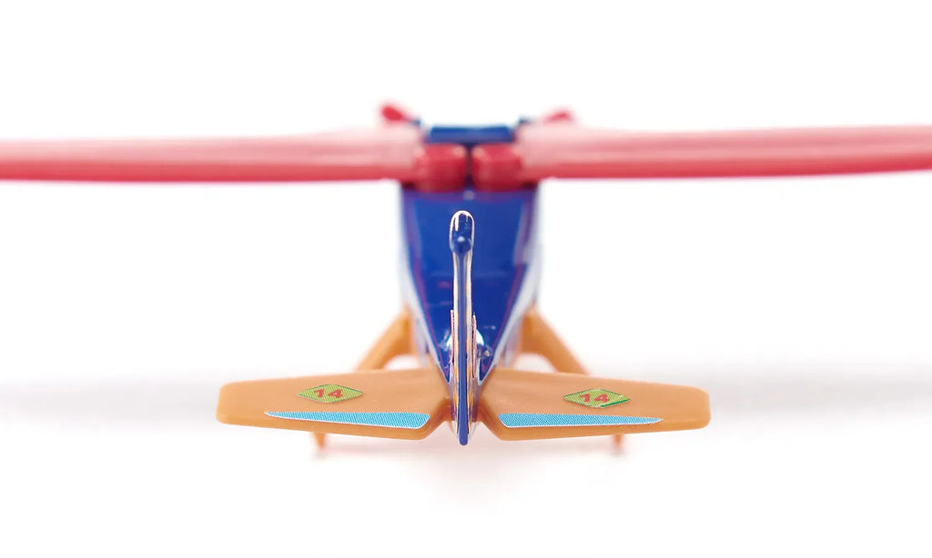 The sports aircraft’s propeller turns, and the wings can be folded in for transporting.