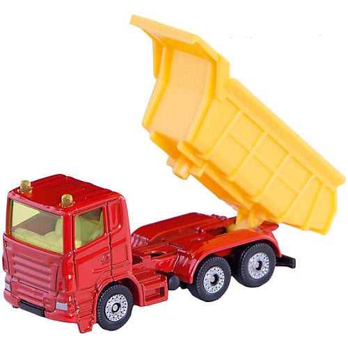 The model's 3-axle chassis and drivers cabin are produced in die-cast metal. The plastic tipper can be tilted. The transporter has smooth-running wheels.