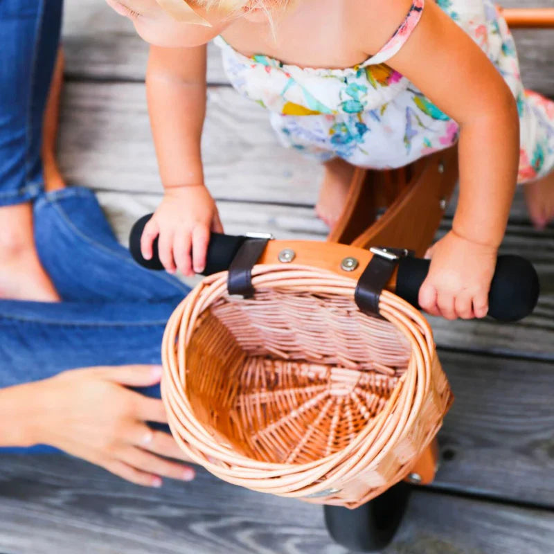The super cute Kinderfeets balance bike basket is a natural handwoven basket with adjustable faux leather straps that attach easily to help your little one tote their treasures.