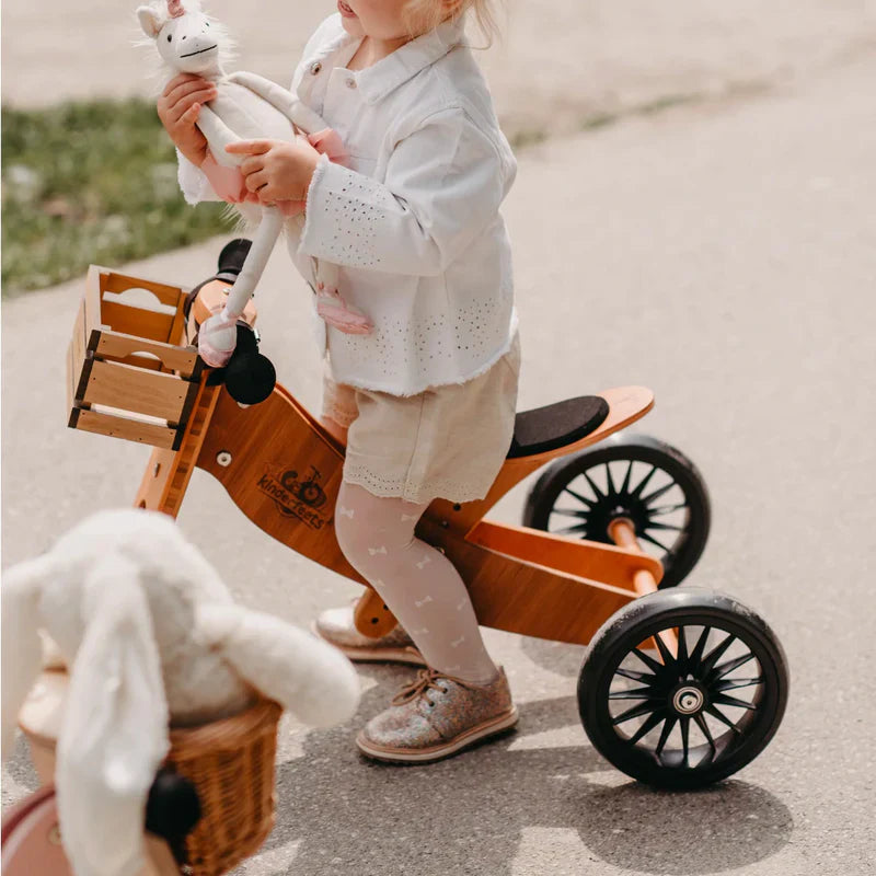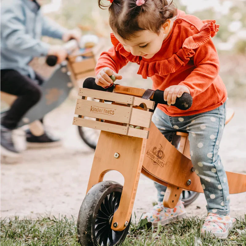 The Kinderfeets Tiny Tot Plus in Bamboo still converts straightforwardly from 3-wheeled trike mode to a 2-wheel balance bike setup. Balance bikes are so helpful in giving young children the opportunity to master balance before the complexity of pedals.