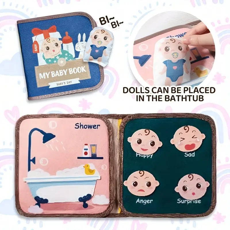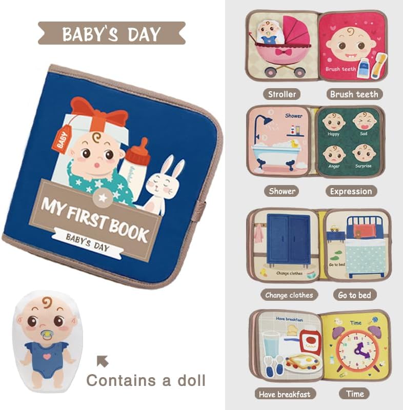 Introduce your little one to the joys of storytelling and everyday routines with this adorable padded cloth book, complete with a miniature soft baby doll. Designed for gentle hands and curious minds, each page invites your child to explore a baby’s day through interactive play.