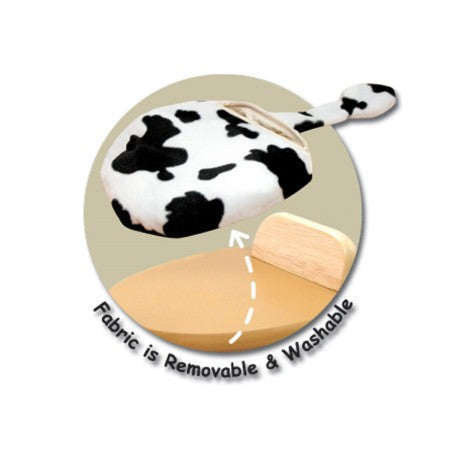 A ride-on cow features a sturdy wooden trike with a comfortable seat. Cushion is removable and washable.
