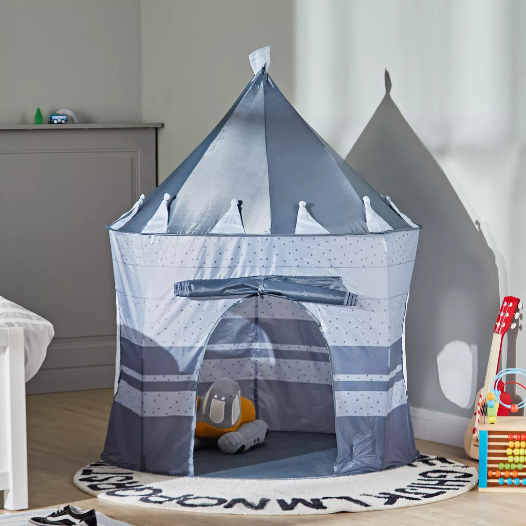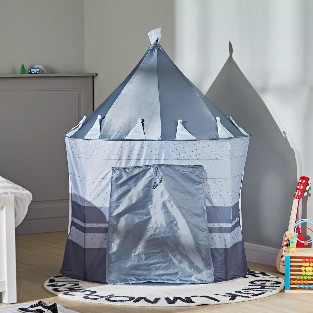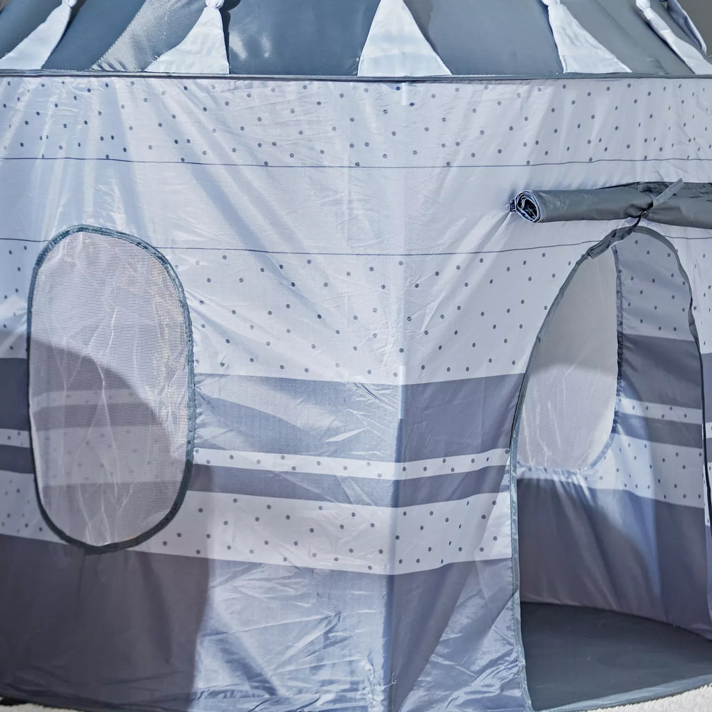 The tent is made of fabric and has the look of a circus tent with a similarly inspired printed design.