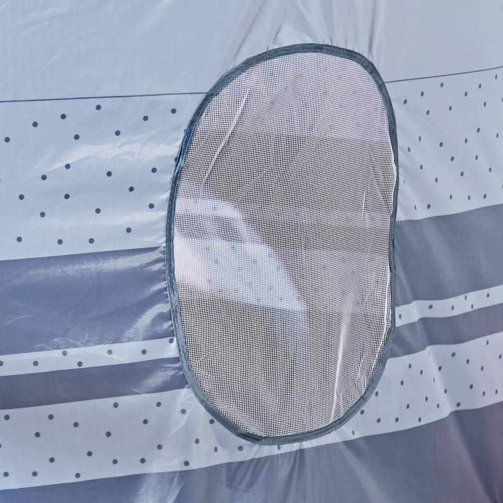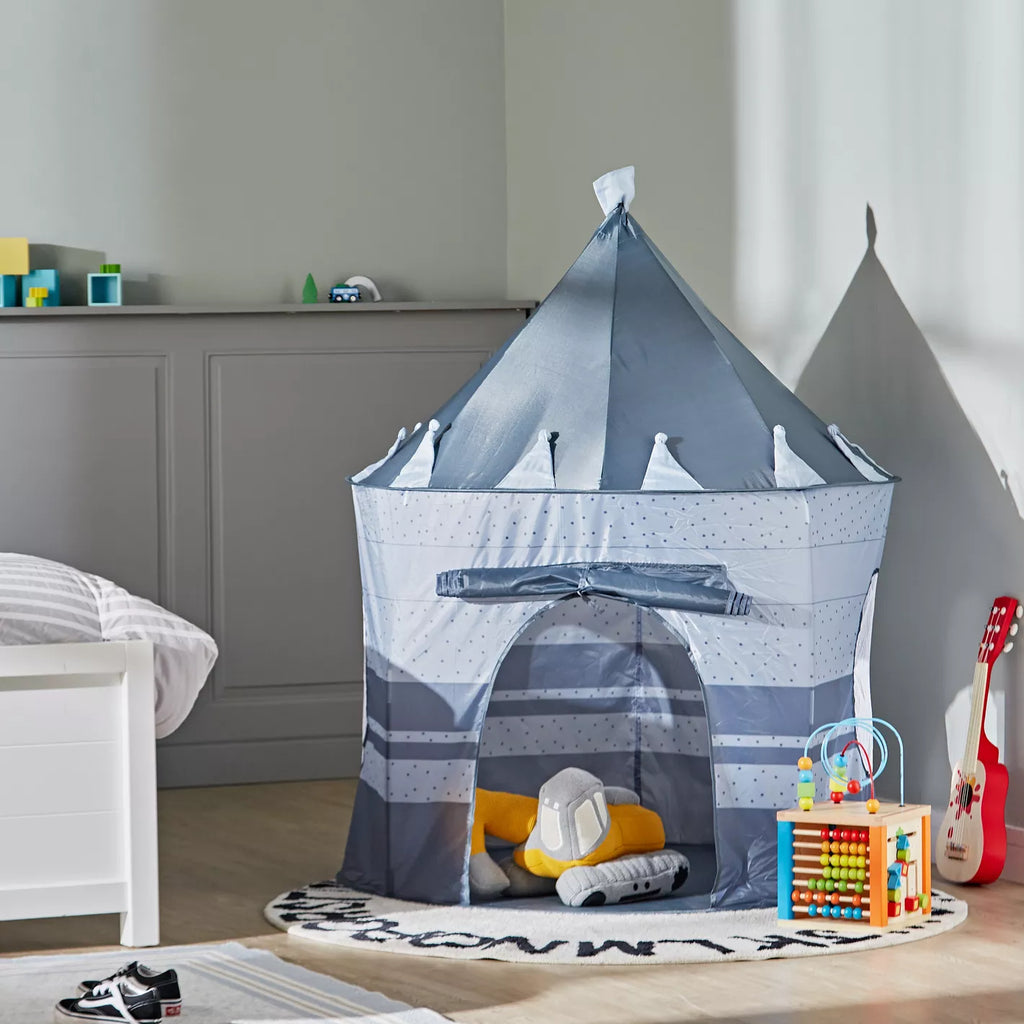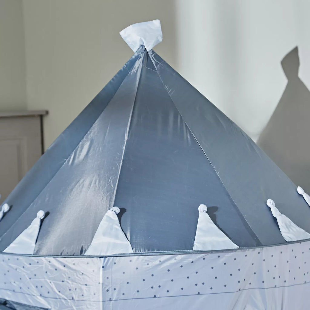 The tent is made of fabric and has the look of a circus tent with a similarly inspired printed design.